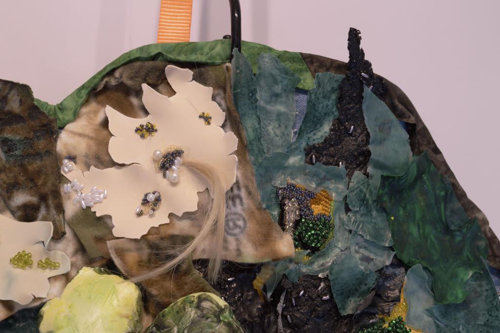 polyurethane dried elmer’s glue sheets, embroidery floss, synthetic hair, beads, embroidery