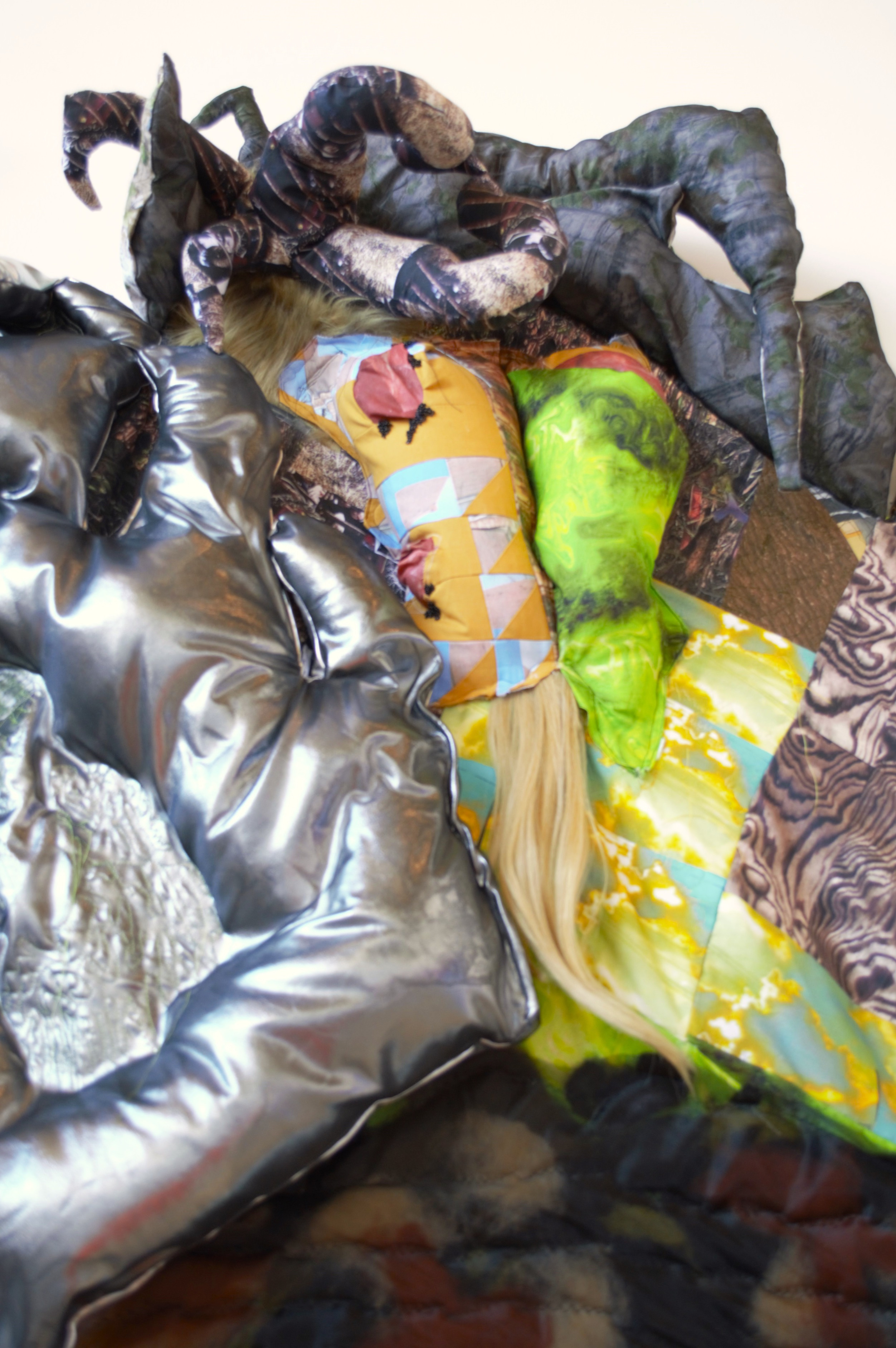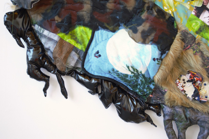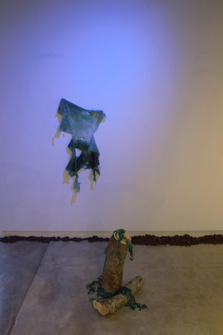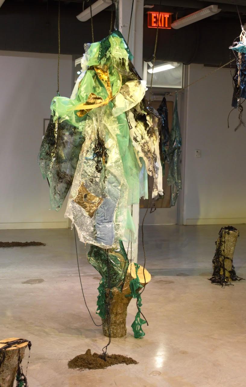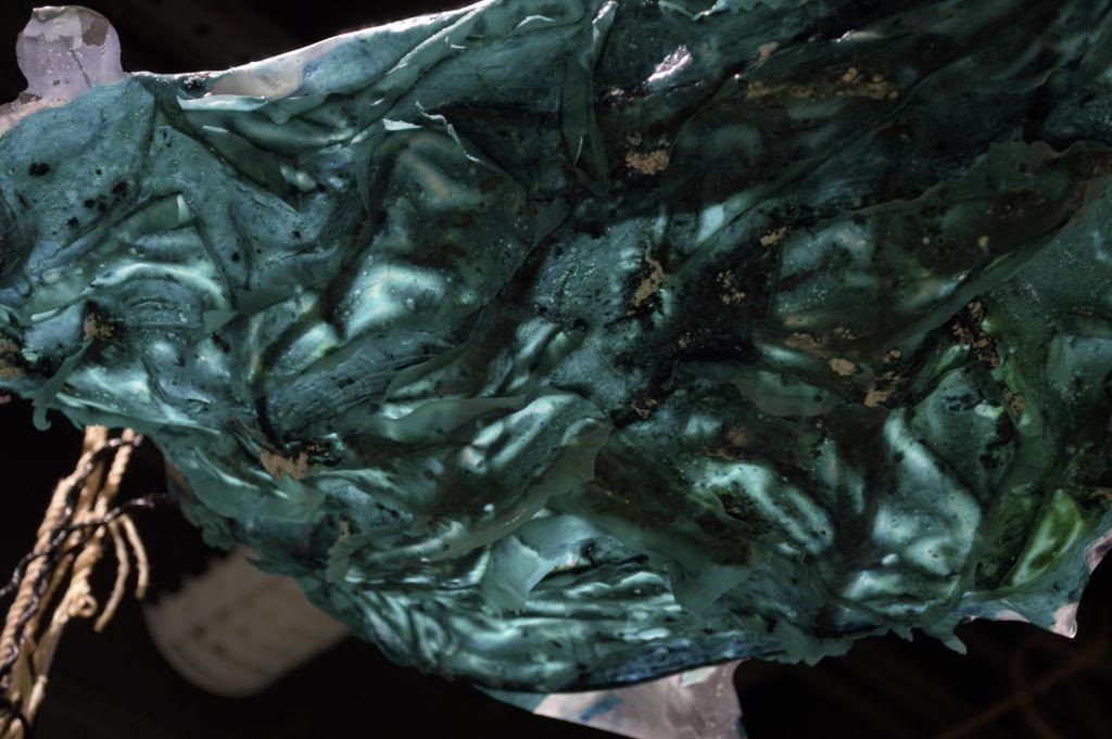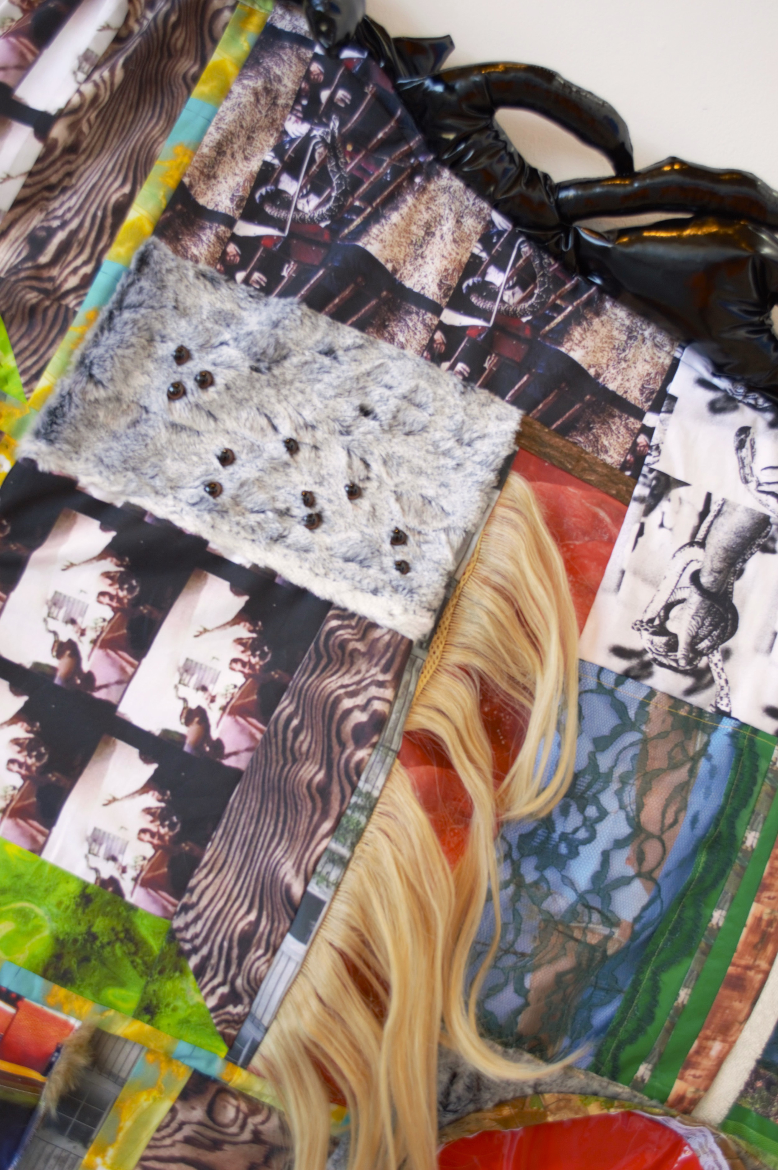 dried Elmer’s glue sheets, dye, soil, synthetic hair, fleece, denim, handmade rope, wood,