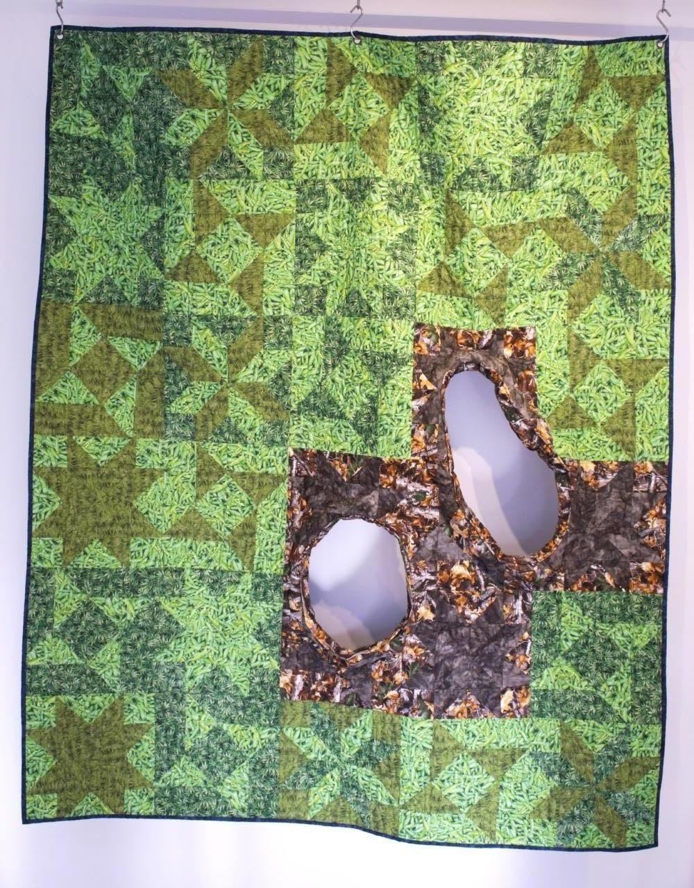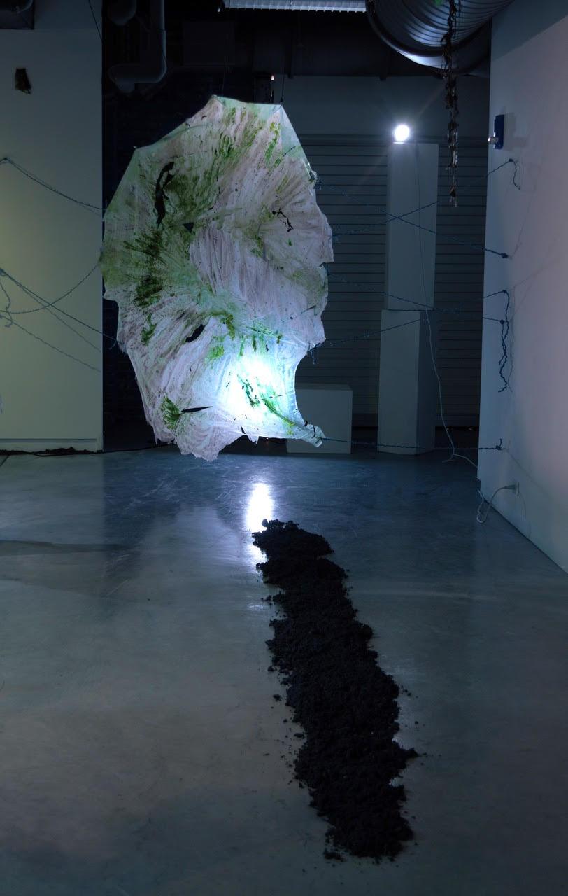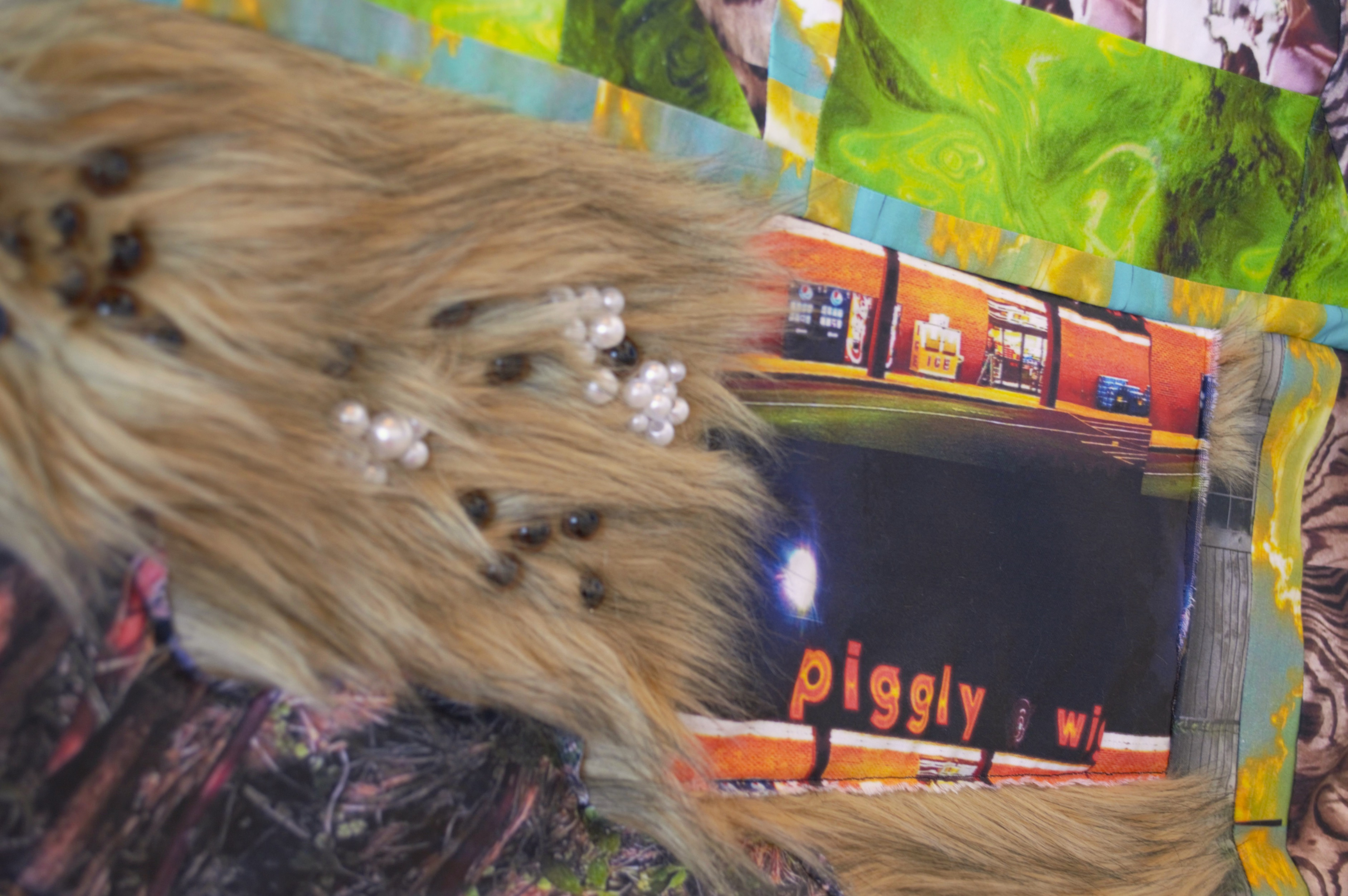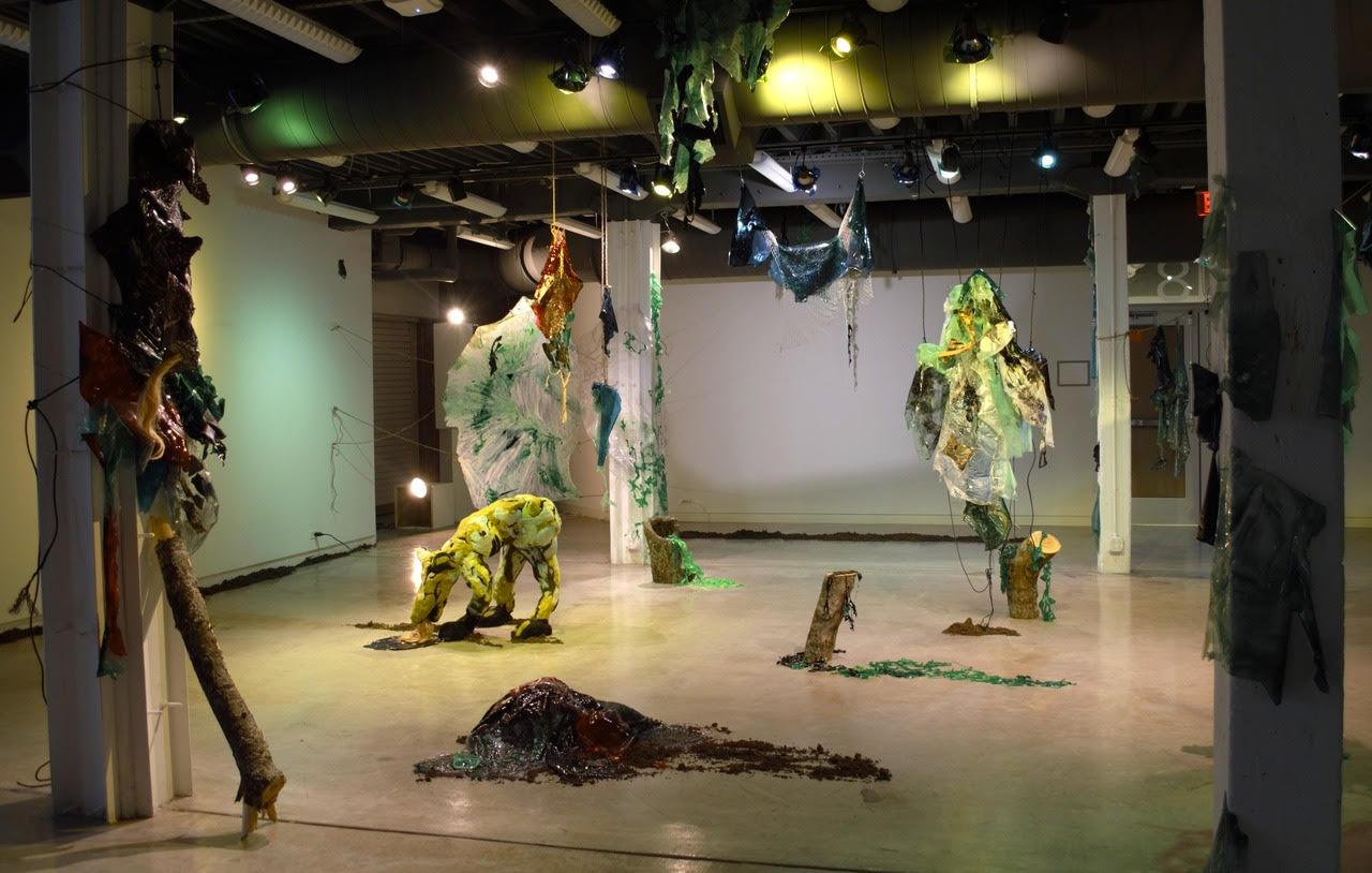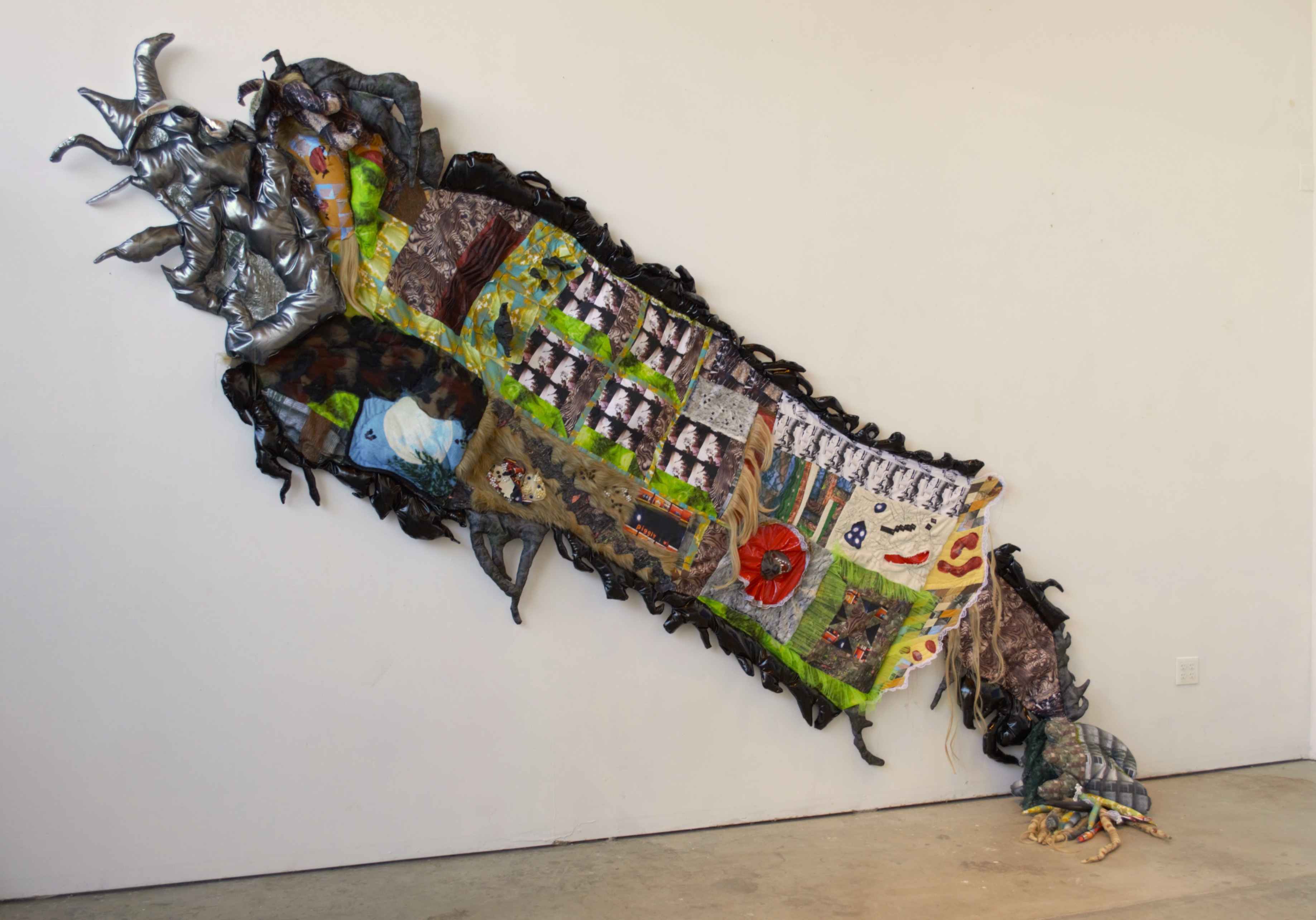 dried Elmer’s glue sheets, dye, soil, synthetic hair, fleece, denim, handmade rope, wood,