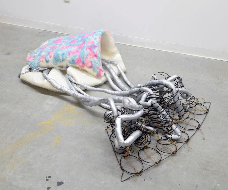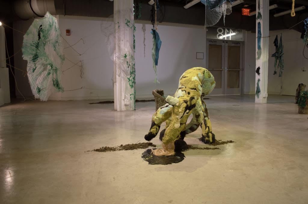 needle felted polyurethane, synthetic hair, dirt, plastic