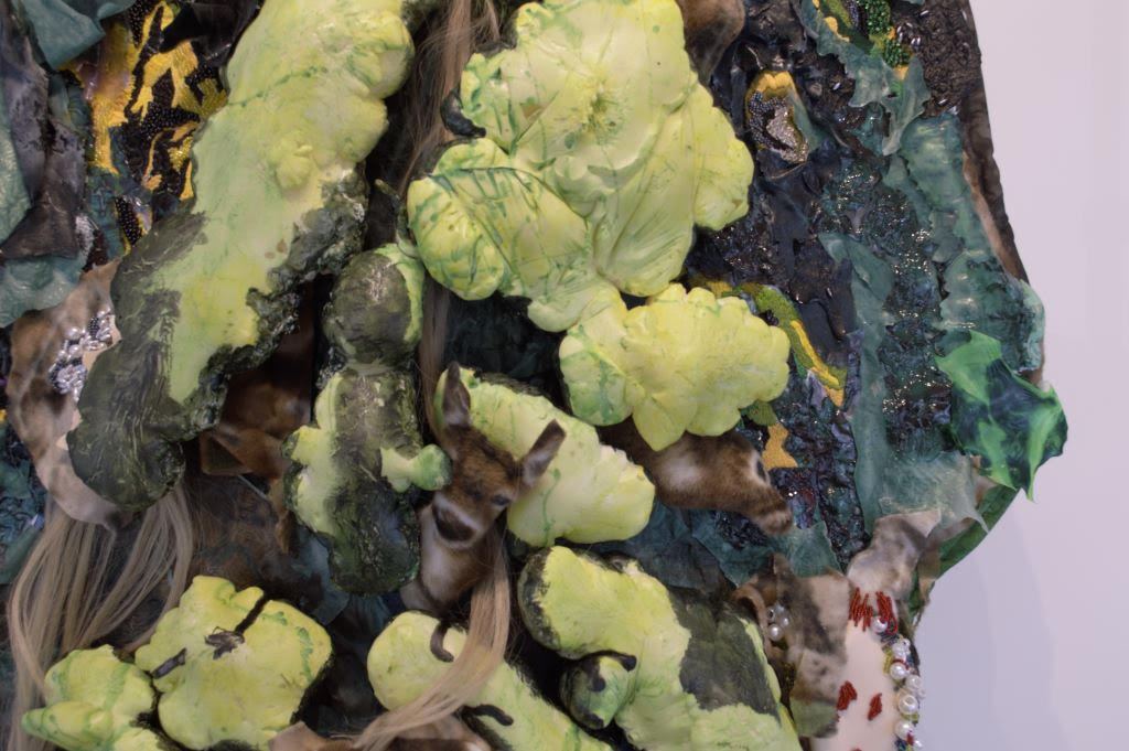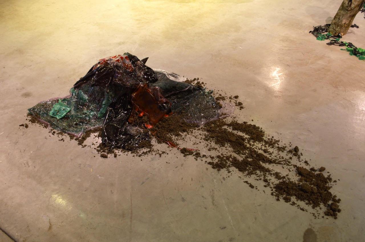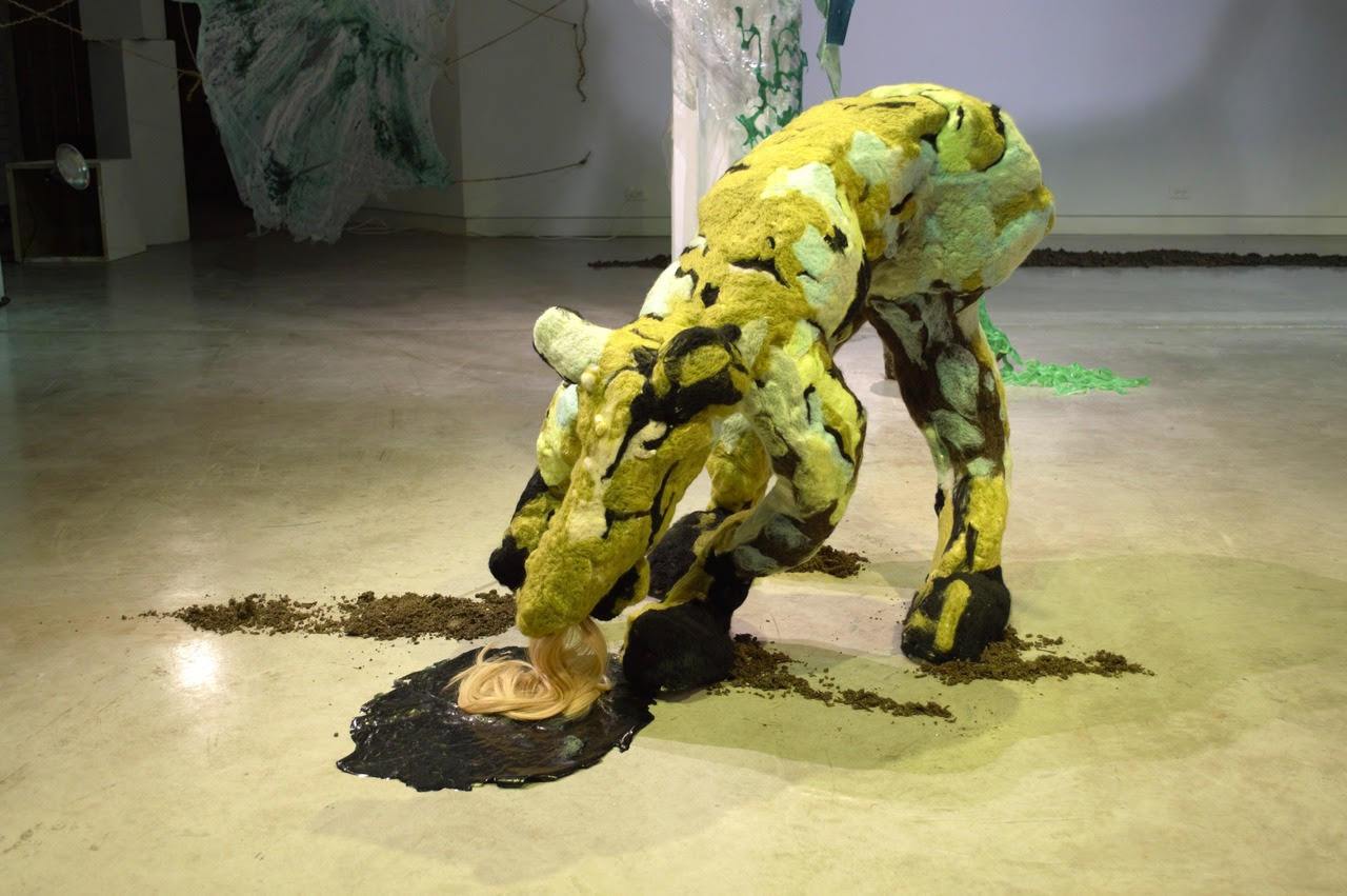 needle felted polyurethane, synthetic hair, dirt, plastic