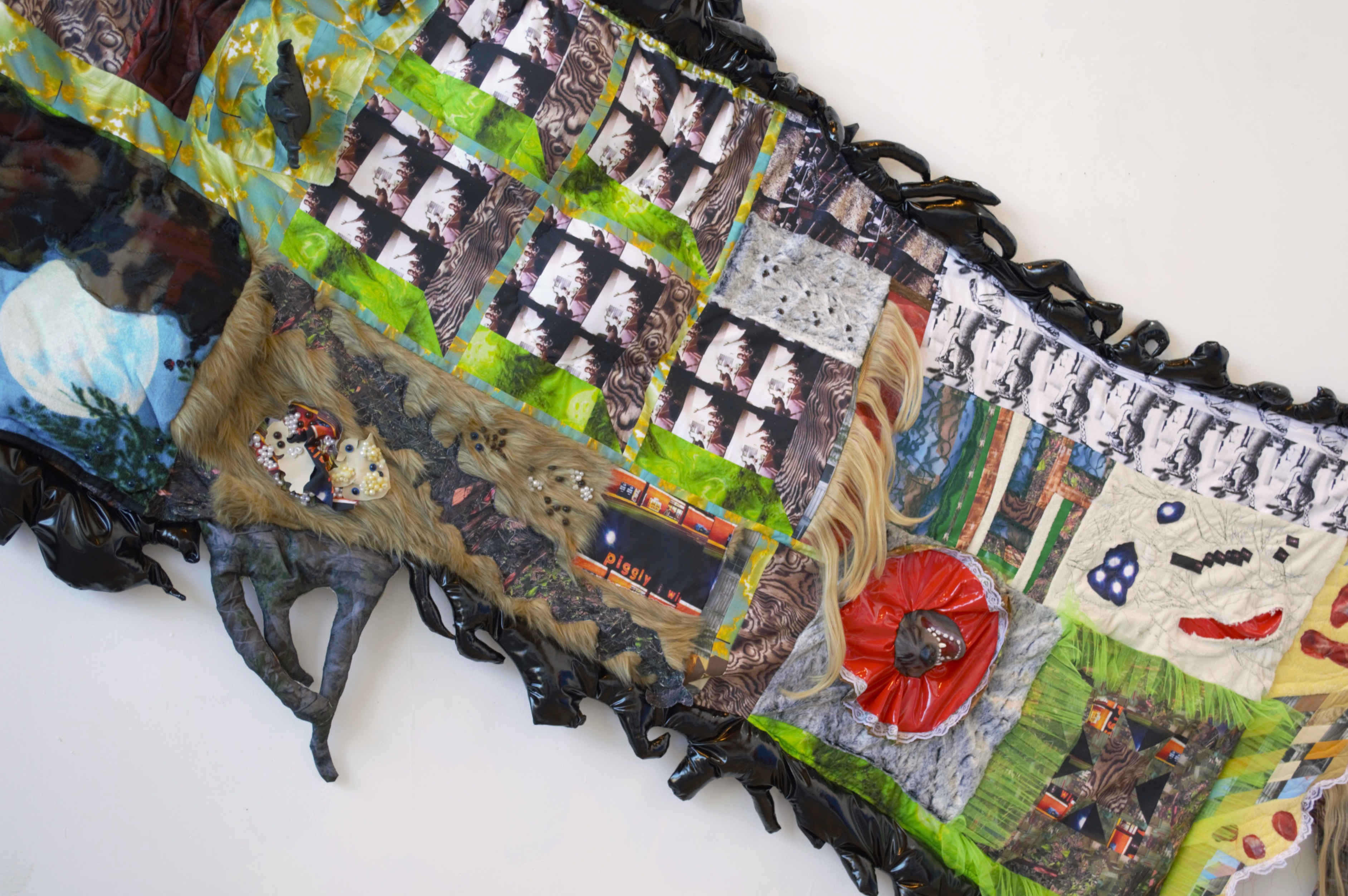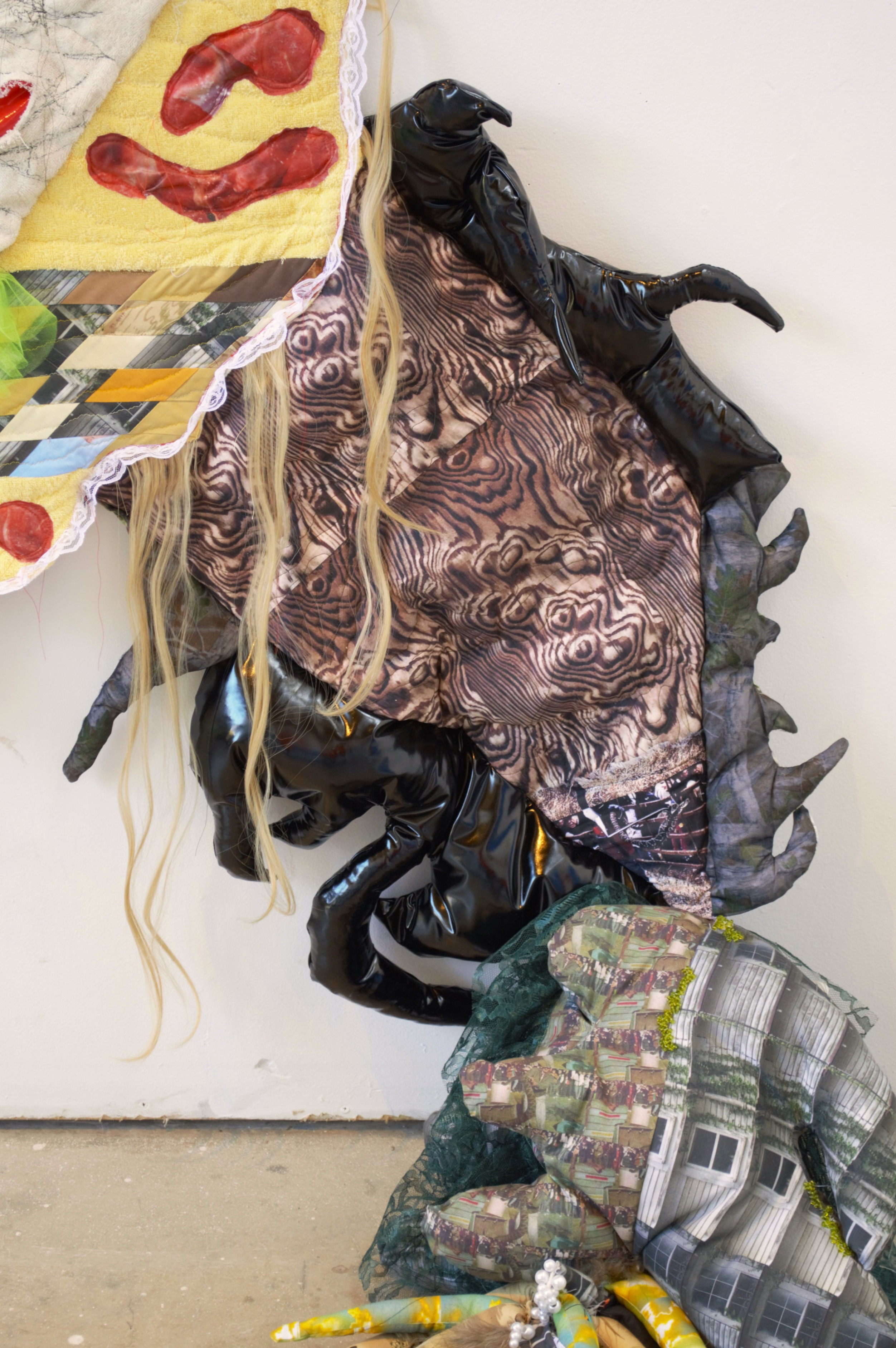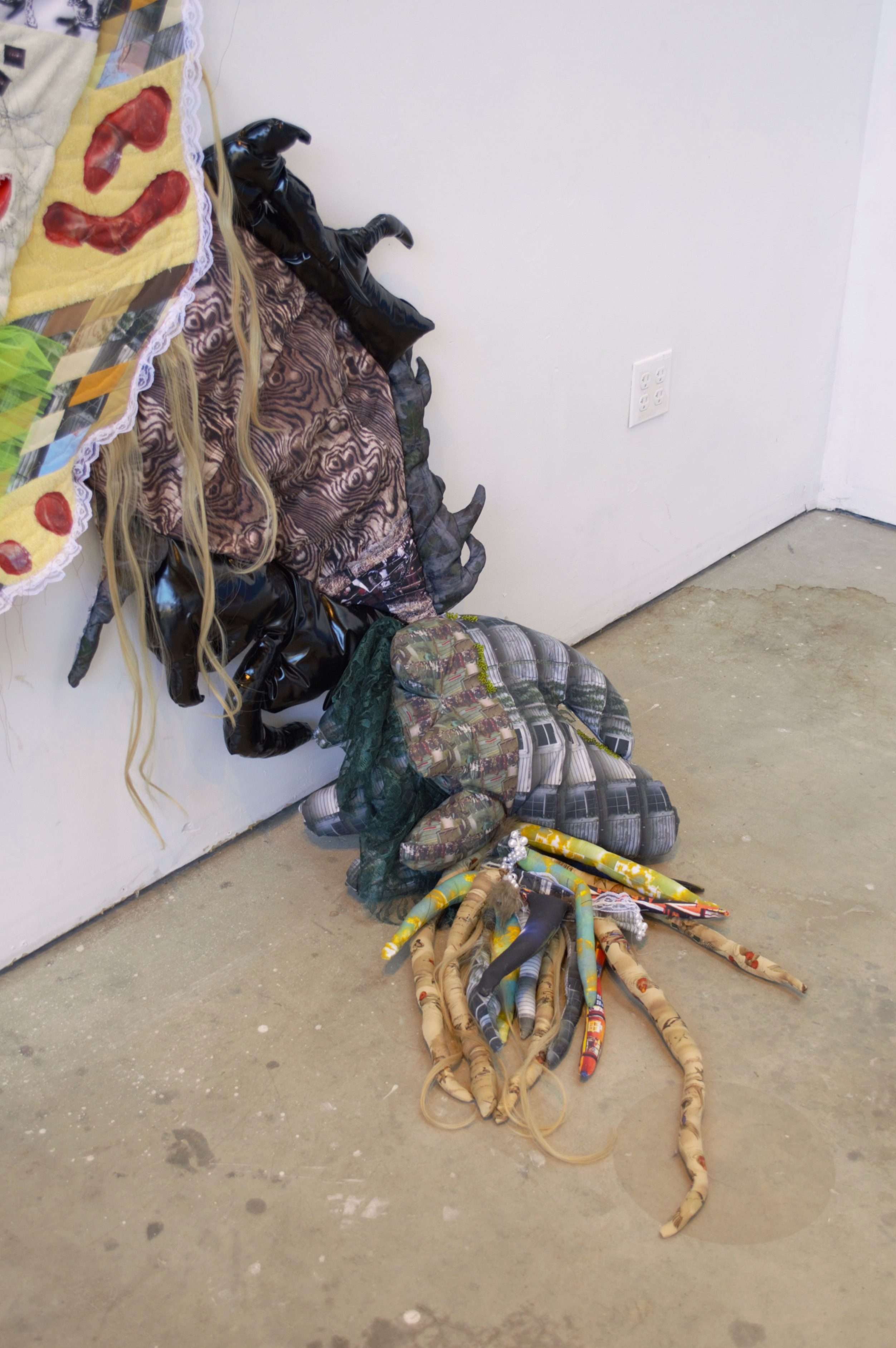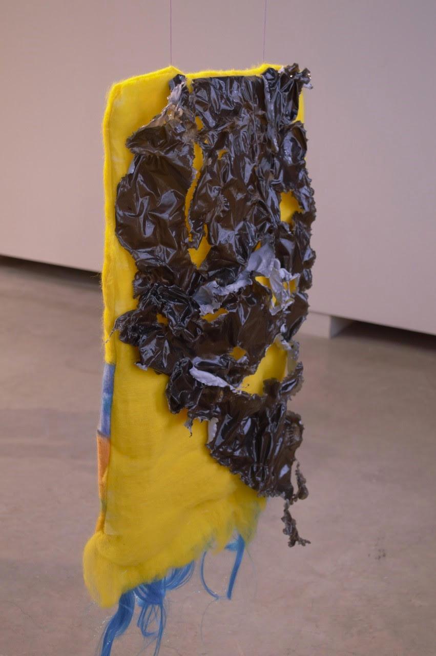 dried Elmer’s glue sheets, dye, soil, synthetic hair, fleece, denim, handmade rope, wood,