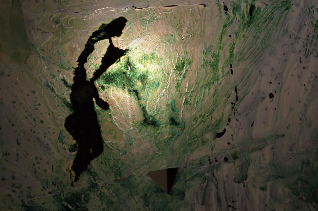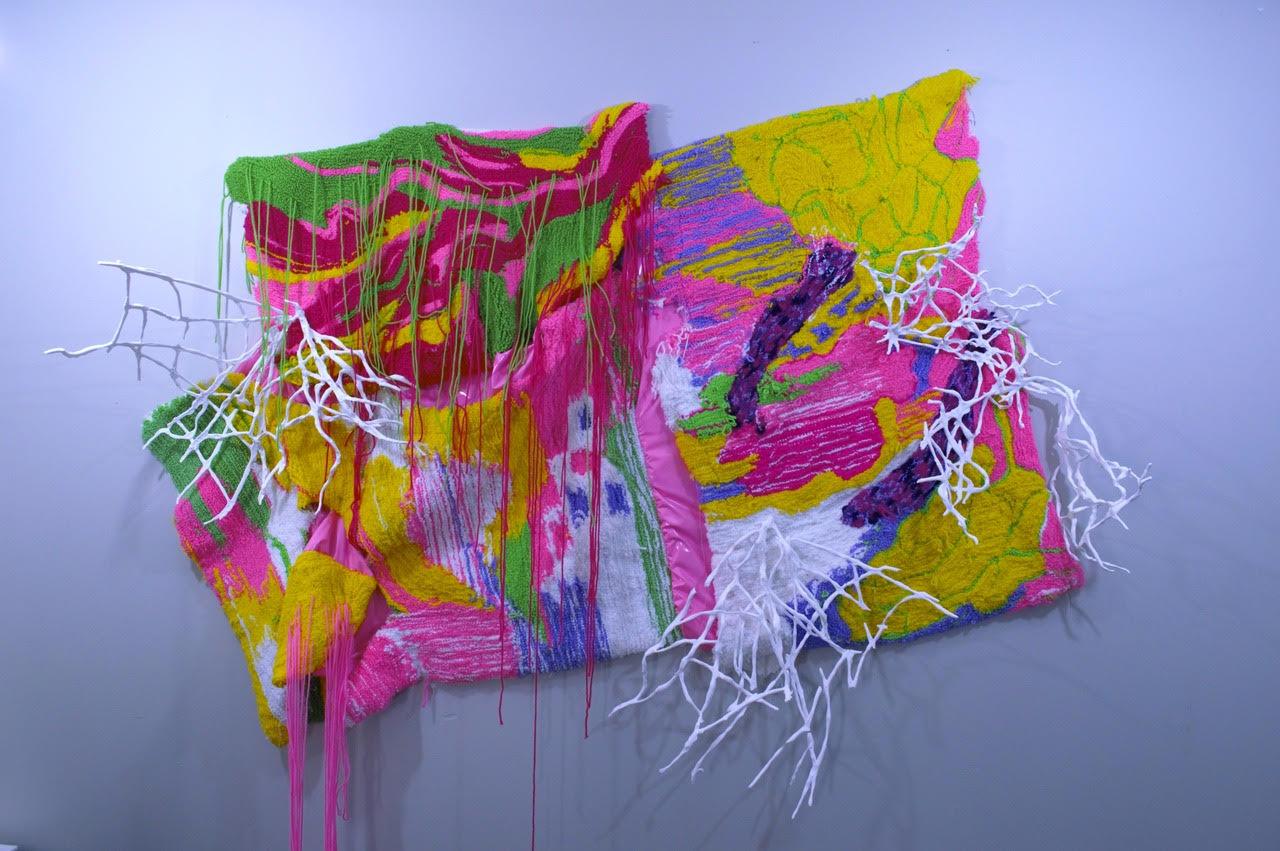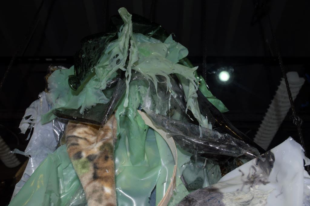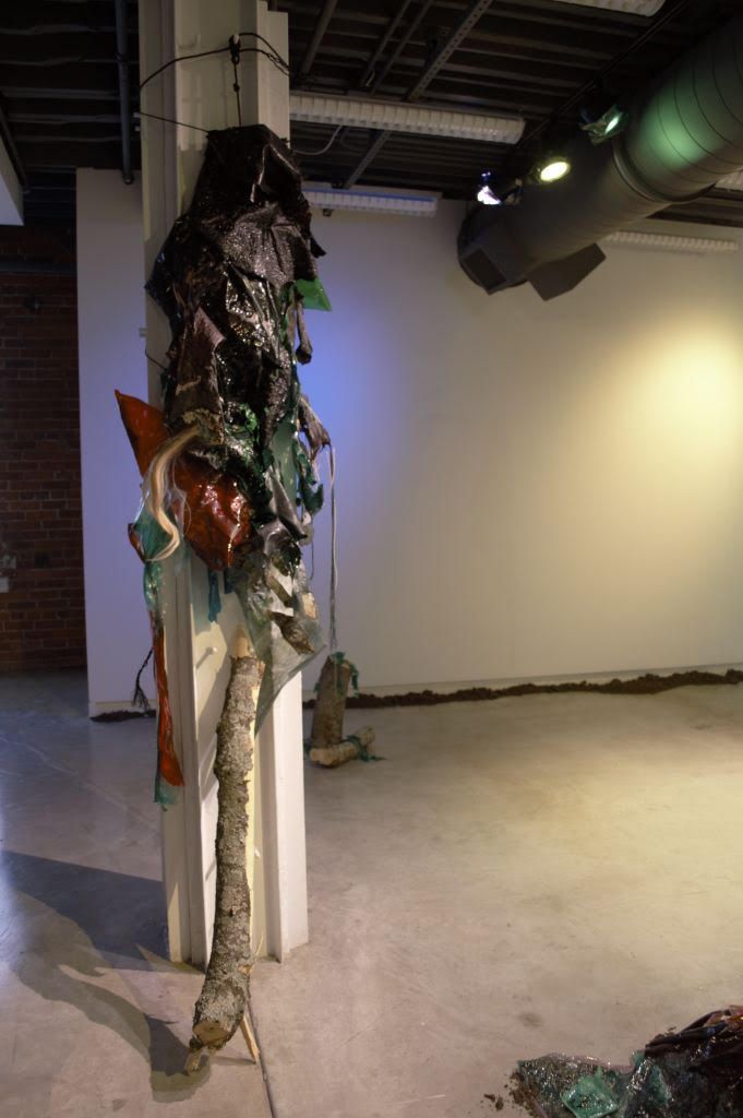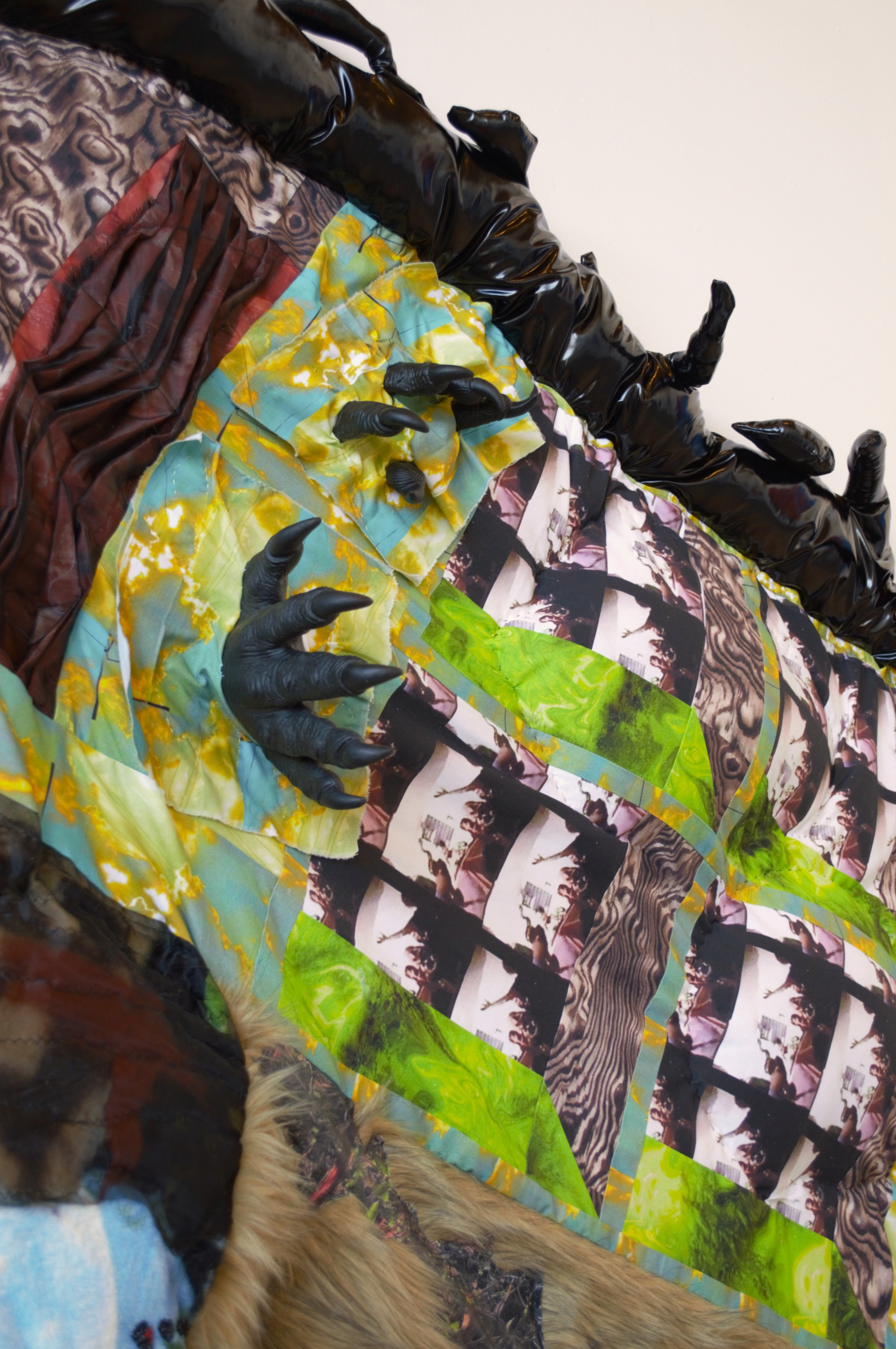 dried Elmer’s glue sheets, dye, soil, synthetic hair, fleece, denim, handmade rope, wood,