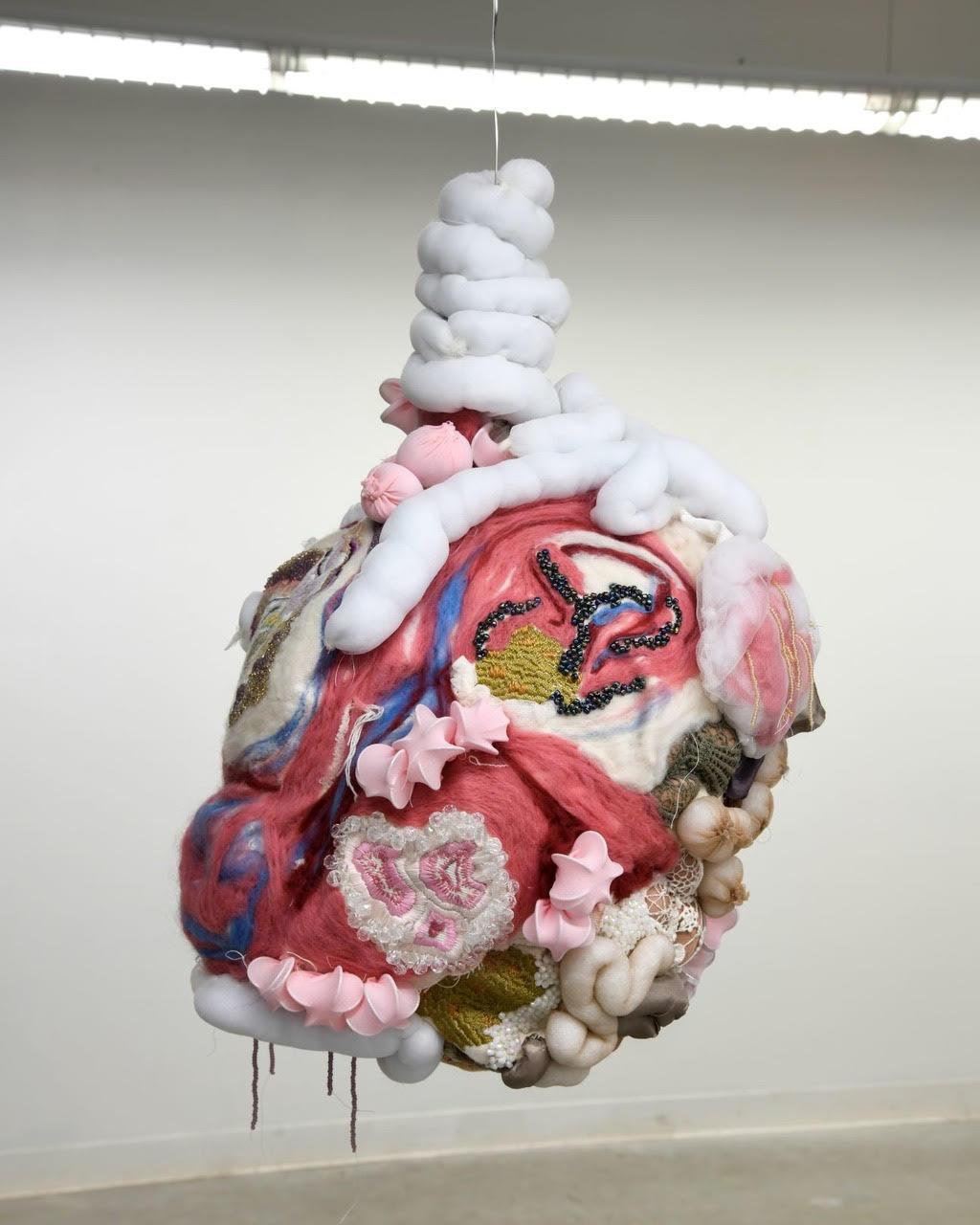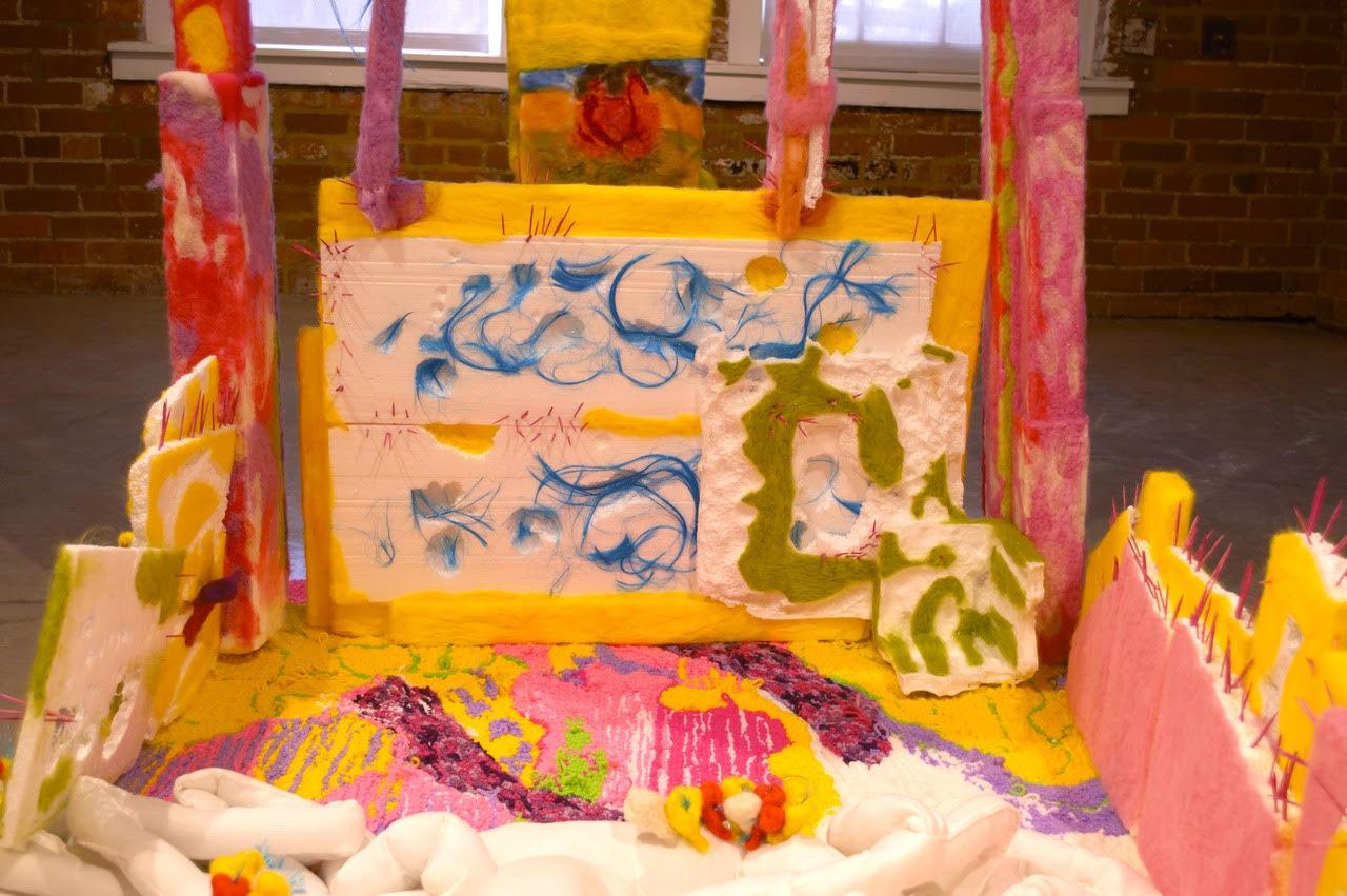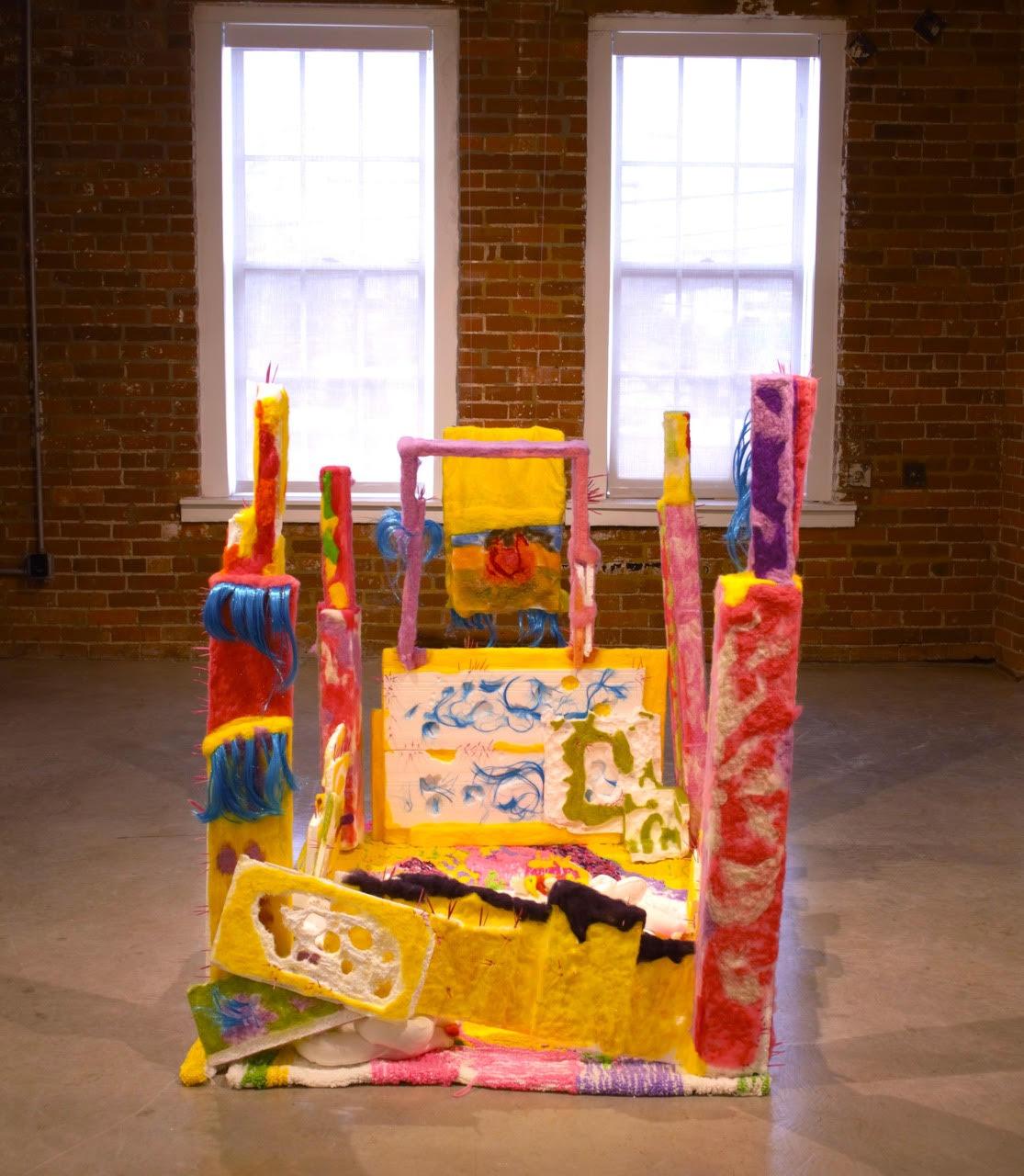 hand needle felt, styrofoam, plastic, yarn, synthetic hair, toothpicks, beads, thread